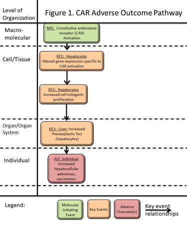 The scientific evidence linking the MIE (CAR activation) and the AO (liver tumors in rodents) have been presented for multiple compounds, and the same sequence of key events was observed for each compound. Blocking the initial MIE (via testing in transgenic mice lacking the CAR nuclear receptor) was able to block all of the subsequent key events, including CAR-specific gene expression, cell proliferation and ultimately liver tumor formation, thus demonstrating high specificity of this association.