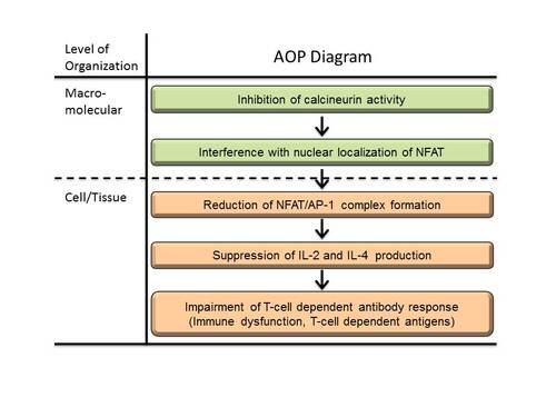 CN inhibitors (CNIs) inhibit CN phosphatase activity to suppress many kinds of immune functions and have been used to prevent hyper immune reactions such as rejection and graft versus host disease (GVHD), and treat autoimmune and allergic disorders such as psoriasis and atopic dermatitis. On the other hand, CNIs are reported to induce immunosuppression-derived adverse effects such as increased frequency and/or severity of infections and increased tumor incidences. CNIs might affect several T-cell derived immune functions to induce compromised host. Among the affected immune functions, T-cell dependent antibody response (TDAR) is an important factor to resist infections and thought to be the useful endpoint on evaluating immunotoxicity of chemicals; therefore, this AOP describes the linkage between the inhibition of CN activity and impairment of TDAR.