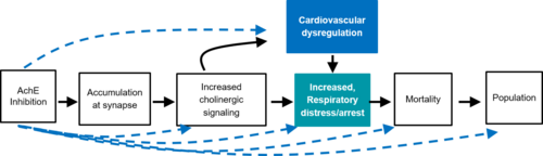 | AchE Inhibition leads to Respiratory distress/arrest | non-adjacent | Moderate | Low |