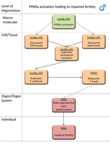 In the presented AOP it is hypothesized that the key events occur in a biologically plausible order prior to the development of adverse outcomes. The PPARα activators have been shown to alter steroidogenesis and impair reproduction [see reviews (Corton and Lapinskas 2004), (Latini et al. 2008), (David 2006)]. However, there are some conflicting reports on the involvement of PPARα as MIE of the proposed AOP (Johnson, Heger, and Boekelheide 2012), (David 2006). The biochemistry of steroidogenesis and the predominant role of the gonad in synthesis of the sex steroids are well established. Steroidogenesis is a complex process that is dependent on the availability of cholesterol in mitochondria. Perturbation of genes responsible for cholesterol transport and steroidogenic enzyme activities in the Leydig cell will lead to a decrease in testicular testosterone (T) production. As a consequence, androgen-dependent tissue differentiation/development is adversely affected. The physical manifestation of this event may be reproductive tract malformation and possibly leads to impaired fertility.