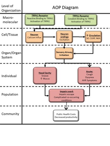 Pulmonary irritation induced by chemical exposure can be divided into two types. One type of irritation, corrosive irritation causes inflammation from tissue destruction and appears to be limited to inhalation of industrial chemicals for example hydrochloric acid, chlorine gas, and ammonia. The second type, sensory irritation is caused by sensory stimulation mediated by activation of specific receptors located in the trigeminal nerve endings and occurs at concentrations that do not result in tissue destruction. Our focus is to develop an adverse outcome pathway (AOP) for sensory irritants. Many inhalable chemicals are sensory irritants (Alarie et al 1966, 1973, Schaper et al., 1993) that can cause physiological responses including pain, mucus production, nasal obstruction, sneezing, coughing, and decreases in respiration rate (Brunning et al., 2014). The target organ of respiratory irritants is ultimately the airways causing inflammation of the trachea, bronchitis, and bronchiolitis. A receptor present in the upper airways is the TRPA1 (transient receptor potential cation channel, subfamily A, member 1) that induces a physiological response to make the subject aware of the presence of chemicals and initiate several defensive biological responses. A wide range of chemicals activates TRPA1 (Bessac and Jordt, 2010). The activation of TRPA1 acts as a gatekeeper of inflammation/irritation and is a critical endpoint in the regulation of exposure to volatile organic chemicals (Bautista et al., 2013; Lehman et al., 2015).