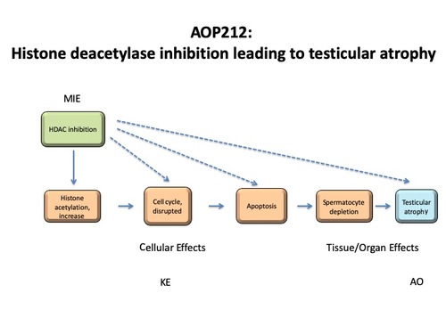 Testicular toxicity is of interest for human health risk assessment especially in terms of reproductive and developmental toxicity, however, the testicular toxicity has not been fully elucidated. Histone deacetylase inhibitors (HDIs) are approved as anti-cancer drugs since HDIs have apoptotic effects in cancer cells. HDIs include short-chain fatty acids, hydroxamic acids, benzamides, and epoxides. The intracellular mechanisms of induction of the spermatocyte apoptosis by HDIs are suggested as histone deacetylase (HDAC) inhibition as MIE, histone acetylation increase, disrupted cell cycle, apoptosis, and spermatocyte depletion as KEs. The adverse outcome has been defined as testicular atrophy. The HDIs inhibit deacetylation of the histone, leading to an increase in histone acetylation. The apoptosis induced by the disrupted cell cycle leads to spermatocyte depletion and testis atrophy. This AOP may be one of the pathways induced by HDIs, which suggests the pathway networks of protein hyperacetylations.