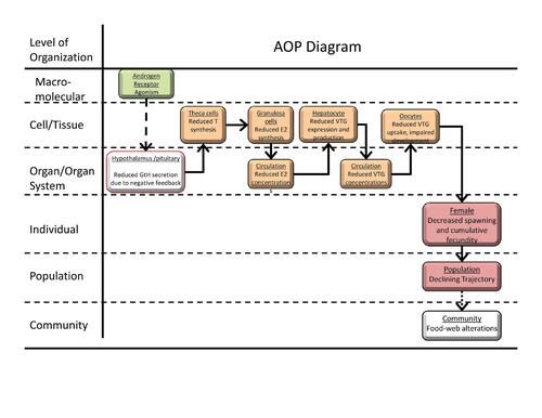 This adverse outcome pathway details the linkage between binding and activation of androgen receptor as a nuclear transcription factor in females and reproductive dysfunction as evidenced through reductions cumulative fecundity and spawning in repeat-spawning fish species. Androgen receptor mediated activities are one of the major activities of concern to endocrine disruptor screening programs worldwide. Cumulative fecundity is the most apical endpoint considered in the OECD 229 Fish Short Term Reproduction Assay. The OECD 229 assay serves as screening assay for endocrine disruption and associated reproductive impairment (OECD 2012). Cumulative fecundity is one of several variables known to be of demographic significance in forecasting fish population trends. Therefore, this AOP has utility in supporting the application of measures of androgen receptor binding and activation as a nuclear transcription factor as a means to identify chemicals with known potential to adversely affect fish populations. At present this AOP is largely supported by evidence conducted with small laboratory model fish species such as Pimephales promelas, Oryzias latipes, and Fundulus heteroclitus. While many aspects of the biology underlying this AOP are largely conserved across vertebrates, particularly oviparous vertebrates, the relevance of this AOP to vertebrate classes other than fish as well as to fish species employing different reproductive strategies has not been established at this time. Thus, caution should be used in applying this AOP beyond a fairly narrow range of fish species with life cycles similar to that of the three species noted above.