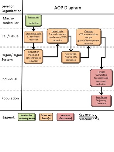 This adverse outcome pathway details the linkage between inhibition of gonadal aromatase activity in females and reproductive dysfunction, as measured through the adverse effect of reduced cumulative fecundity and spawning. Initial development of this AOP draws heavily on evidence collected using repeat-spawning fish species. Cumulative fecundity is the most apical endpoint considered in the OECD 229 Fish Short Term Reproduction Assay. The OECD 229 assay serves as screening assay for endocrine disruption and associated reproductive impairment (OECD 2012). Cumulative fecundity is one of several variables known to be of demographic significance in forecasting fish population trends. Therefore, this AOP has utility in supporting the application of measures of aromatase, or in silico predictions of the ability to inhibit aromatase, as a means to identify chemicals with known potential to adversely affect fish populations and potentially other oviparous vertebrates.