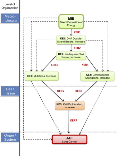 The present AOP compiles data in the most simplified, modular path to lung cancer from an MIE of deposition of energy. An estimated 1.5 million people worldwide die of lung cancer annually (https://www.wcrf.org) with smoking being the leading cause globally, followed by radon gas. Multiple other environmental factors (e.g., asbestos, air pollution and arsenic) in combination with smoking can increase risk (Hubaux et al., 2012). Indeed, studies show that the histological lung profile of smokers is very different from non-smokers exposed to high radon levels (Kreuzer et al., 2000). This is in part due to the complexity of the interaction of each stressor with macromolecules within the cell. Therefore, at the different levels of biological organization, it is important to distinguish the mechanisms between lung cancer from smoking and that of radon exposure. Furthermore, studies show that residential radon gas can contribute to lung cancer, however, there remains uncertainty in risk estimates due to the dosimetry of the exposures from the lower doses (Samet et al., 2000 and 2006). The cellular/tissue effects of low dose radiation exposure are still not well understood, and the traditional linear no-threshold model cannot be assumed to accurately estimate risk (Ruhm et al., 2016; Shore et al., 2018).