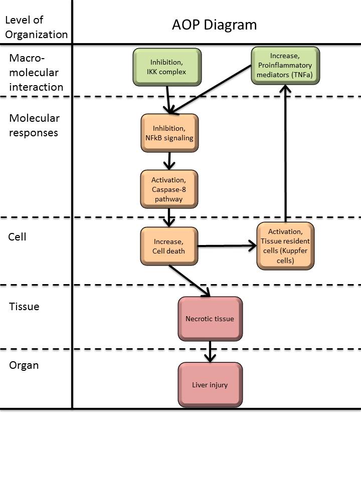 This AOP describes the key events of chemically induced IKK complex inhibition which leads to liver injury during TNF signaling. This AOP starts with the molecular initiating event “inhibition of the IKK complex”. When the IKK complex is inhibited, the NFkB pathway activation is disturbed, leading to less transcription of anti-apoptotic genes. Then, without apoptosis protection, the activation of Caspase 8, is not inhibited anymore. Caspase 8 activates caspase 3, leading to apoptosis, or cell death. Finally, too much cell death will lead to necrotic tissue and eventually liver failure.