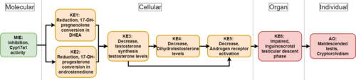 This Adverse Outcome Pathway describes the linkage between a decrease in 7α-hydroxylase/C17,20-lyase (Cyp17a1) activity and a specific reproductive malformation in male newborns : impaired testicular descent also called cryptorchidism.