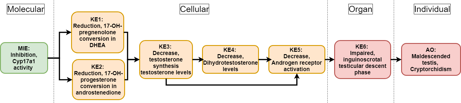 Cyp17a1 enzyme is known to mediate 17 alpha-hydroxylase and 17,20-lyase activities, the distinction between the two being functional and not genetic or structural. Mainly expressed in Leydig cells, this steroidogenic enzyme catalyzes the conversion of 17-OH-pregnenolone and 17-OH-progesterone to dehydroepiandrosterone (DHEA) and androstenediol, respectively. In that way, a decrease in Cyp17a1 activity would inevitably lead to a decline in both steroid precursors’ levels. As a result, this succession of key events will affect testosterone (T) and dihydrotestosterone (DHT) synthesis and circulating levels. A direct consequence to such a drop in major androgens levels would be a decline in androgen receptor activation, causing potential disturbances in development and maintenance of the male reproductive system such as cryptorchidism. To understand this AOP, it is important to notice that the second stage of the testicular descent process called “inguinoscrotal“ is an androgen-dependent event that can be dramatically affected by variations in androgenic activity.