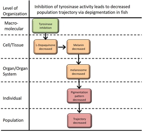 This AOP is designed to estimate changes in population trajectory of fishes resulting from the inhibition of the enzyme tyrosinase (TYR), which is rate-limiting in the control of melanogenesis. Since tyrosinase inhibition leads to the decrease of DOPAquinone synthesis, tyrosinase inhibition by unknown or known chemicals will lead to L DOPA quinone inhibition and decrease of eu - and pheo -melanogenesis. Subsequently, these KEs possibly lead to the decline of teleost population. Hence this AOP could support the use of an in vitro high throughput screening assay for tyrosinase inhibition to identify chemicals that may reduce pigmentation in fish leaving them vulnerable to predation and unable to perform important social behaviors important to their survival and reproduction. Decreased population trajectory resulting from reduced pigmentation patterns in the fish body is a potential endpoint for eco-toxicity. The proposed endpoint will provide useful high throughput risk assessment screening tools for potential chemicals. Consequently, this AOP can be applied to the prediction of eco-toxicity caused by the inhibition of TYR.