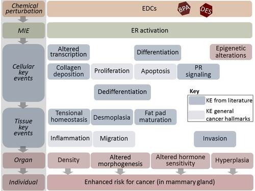 This adverse outcome pathway (AOP) links gestational EDC exposure to enhanced breast cancer risk. The molecular initiating event (MIE) is gestational estrogen receptor (ER) activation; particularly, stromal activation at in utero time of exposure. The ER is a master transcriptional regulator, with proliferation as its primary effect, and is the main mediator of breast development [24, 25]. Human-relevant EDC exposure triggers transcriptional activity that promotes altered signaling between the epithelial and stromal tissue compartments leading to disrupted tensional homeostasis [26] and tissue architecture. Inflammation and altered cellular differentiation are major cell- and tissue-level key events (KEs) mediating these disruptions. The pathway converges on the following mammary gland adverse outcomes (AOs) at the tissue- and organ-levels: altered density, structure and hormone sensitivity along with hyperplasia. Epigenetic alterations are a cellular-level AO that propagate gestational EDC exposure to later-life risk through cellular memory that directs ER-mediated gene expression and altered mammary development. Risk of tumorigenesis follows from these AOs.