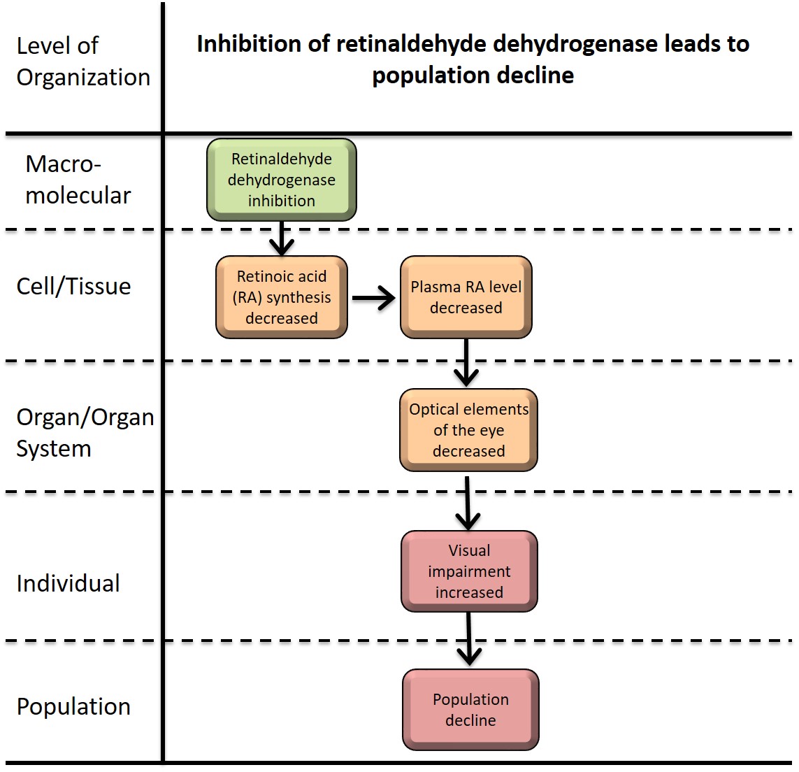 The present AOP is designed to estimate potential AO of fishes results from the retinaldehyde dehydrogenase (RALDH) inhibition. Visual impairment results from eye development of an embryonic cell might lead to population decline which is the potential endpoint. This AOP will provide a useful risk assessment tool for the toxic assessment of chemicals. Furthermore, this AOP can be applied to the prediction of eco-toxicity caused by the inhibition of RALDH.