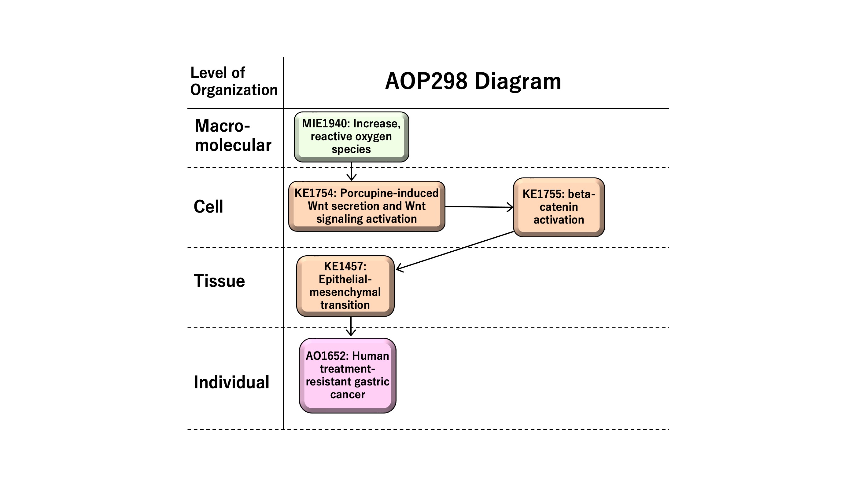 This AOP entitled “Increase in reactive oxygen species (ROS) leading to human treatment-resistant gastric cancer” consists of MIE as KE1115 “Increase, ROS” followed by KE1 as KE1754 “porcupine-induced Wnt secretion and Wnt signaling activation,” KE2 as KE1755 “beta-catenin activation,” KE3 as KE1457 “epithelial-mesenchymal transition (EMT),” and AO as KE1651 “human treatment-resistant gastric cancer.” ROS has multiple roles in disease, such as the development and progression of cancer or apoptotic induction, causing anti-tumor effects. In this AOP, we focus on sustained levels of chronic reactive oxygen species (ROS) in inducing therapy resistance in human gastric cancer. Epithelial-mesenchymal transition (EMT), a cellular phenotypic change from epithelial to mesenchymal-like features, demonstrates cancer stem cell-like characteristics in human gastric cancer. EMT is induced by Wnt/beta-catenin signaling, providing the rationale to have Wnt secretion and beta-catenin activation as KE1 and KE2 on the AOP, respectively. The AOP might be useful for the development of anti-cancer drugs or the prediction of adverse effects of therapeutics, which are of possible regulatory relevance.