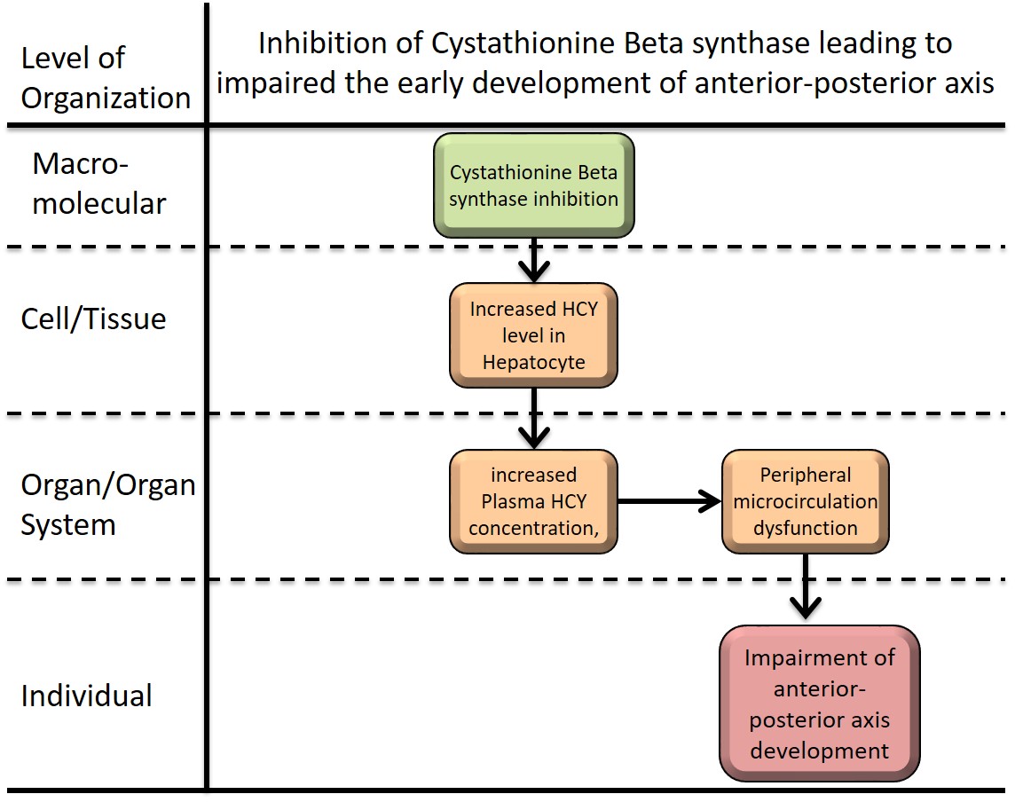 This AOP is designed to detect changes of Hcy concentration in early developmental condition including fish larvae by chemical inhibition of CBS. Accumulation of neuronal damage in fish is the should be measured together in in vivo experiment for clarifing the adverse outcome. In addition, screening of selective potential chemical inhibitor of CBS will be performed in in vitro cell-based assay in different species.