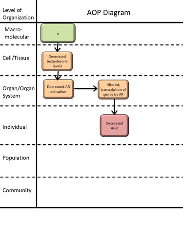 The upstream part of the AOP, converging on KE-286 (altered transcription of genes by the AR), has a broad applicability domain. It is built primarily on mammalian data and includes all life stages, but only males due to the specification of intratesticular testosterone in KE-2298. It could be extended to cover non-mammalian vertebrates by adding additional relevant knowledge, as previously discussed (Draskau et al, 2024). The overall applicability domain is limited by AO-1688 (decreased AGD). The AGD is strongly influenced by androgen action during critical fetal stages in mammals, with evidence from humans (Murashima et al, 2015; Thankamony et al, 2016), and from numerous gestational exposure studies in rats and mice to anti-androgenic chemicals (Gray et al, 2001; Schwartz et al, 2019). The male masculinization programming window occurs at a developmental stage included in the applicability domain of these AOPs and corresponds to around gestational day 16-20 in rats and gestation weeks 8-14 in humans (Welsh et al, 2008). Only males are included in the applicability domain since the male AGD, but not the female AGD, is shortened by decreased androgen action (Schwartz et al, 2019).