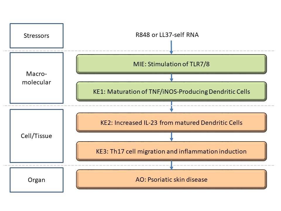 IL-17 mediates the psoriasis response, promoting such activities as neutrophil migration to the epidermis,and proliferation of epidermal cells, which leads to the outbreak of psoriasis rash. Thus, psoriatic skin is induced mainly by overproduction of IL-17, which leads to a variety of adverse effects. We have identified a number of key events (KEs) along this pathway and created an AOP for stimulation of TLR7/8 that leads to psoriatic skin disease based on these key event relationships(KERs).
