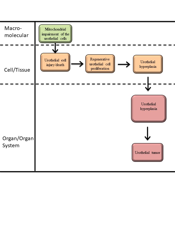 We are proposing an AOP framework for urothelial cytotoxicity followed by regenerative hyperplasia and the development of benign and malignant proliferative lesions after long-term chemical exposure. In addition, we suggest direct mitochondrial dysfunction process as one of the possible Molecular Initiating Event (MIE) for this AOP. Our lab has a long experience with urothelial toxicity resulting from exposure to the herbicide diuron. Currently, we are adopting in vitro approaches using human bladder cells (1T1) exposed to diuron and its metabolites to confirm the mitochondrial damage and to identify the intracellular pathways that are compromised after exposure. We suggest that the mitochondrial impairment in urothelial cells leads to urothelial injury/death followed by regenerative cell proliferation and hyperplasia, culminating in urothelial tumors.
