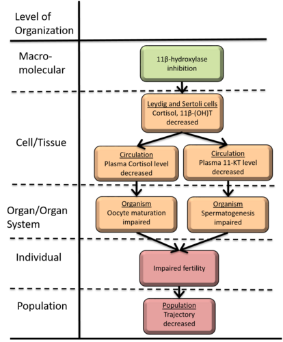 This AOP is designed to estimate changes in the trajectory of fishes by potential inhibitors. Decreased trajectory applicable to both sex in the fish which is a potential endpoint for endocrine disruptions by inhibition of 11β-hydroxylase. The proposed endpoint will provide a useful high throughput risk assessment screening tool for possible chemicals. Consequently, this AOP can be applied to the prediction of VMG-eco and relevant to EDTA caused by the inhibition of 11β-hydroxylase.