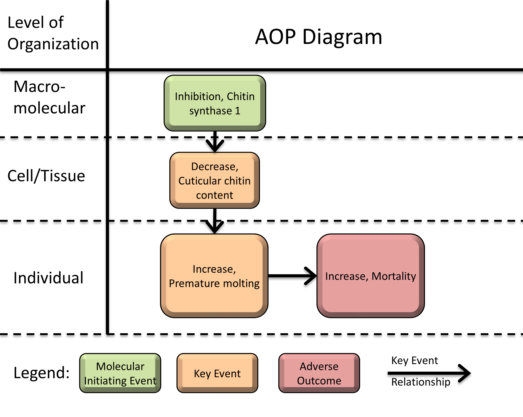 Arthropods (including insects, crustaceans and arachnids) need to shed their exoskeleton in order to grow and reproduce. This process, also called molting or ecdysis, is mediated by behavioural mechanisms which involve the skeletal muscles (Ayali 2009; Song et al. 2017a). In order to properly shed its cuticle, the organism needs to possess a newly synthesized cuticle that possesses a certain integrity to support this process. Since chitin is a major constituent of the cuticle, it contributes substantially to its integrity (Cohen 2001; Vincent and Wegst 2004). Chitin is synthesized from uridine diphosphate-N-Acetylglucosamine (UDP-GlcNAc) in a polymerization reaction by the transmembrane enzyme chitin synthase isoform 1 (CHS-1). CHS-1 is localized on the apical side in the cuticular epithelium. Since chitin and the process of chitin synthesis does not occur in vertebrates, it can and has been exploited for the design of pest controlling agents. Inhibitors of chitin synthesis may not only be of use for the control of unwanted arthropods and fungi, they may also pose a risk for beneficial arthropods such as insects and crustaceans. Disruption of chitin synthesis or the endocrine mechanisms controlling molting generally lead to a disruption of ecdysis (Merzendorfer et al. 2012; Song et al. 2017a; Song et al. 2017b). If the amount of chitin in the cuticle decreases, the affected organism may not be able to molt properly and will most probably die of starvation or suffocation (Camp et al. 2014; Song et al. 2017a). Alternatively, if molting is completed despite an immature cuticle, the organism may be deformed and die as a consequence of a weak cuticle. Therefore, the present AOP should build the basis of a mechanistic approach for the systematic evaluation and the risk assessment of chemicals interfering with chitin synthesis by directly inhibiting CHS-1.
