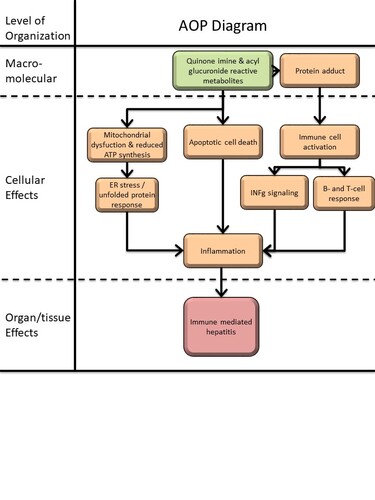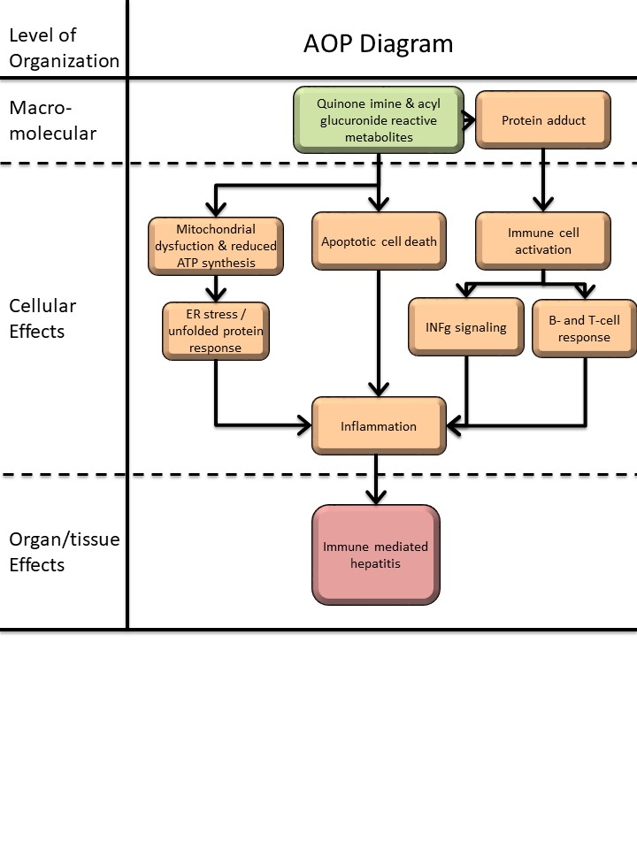 Drug induced hepatitis is a multistep process and frequently involves reactive metabolites which subsequently form drug-protein adducts. These are sensed by antigen presenting cells to elicit innate and adaptive immune responses (Adams et al. 2010). Diclofenac is extensively metabolized by CYP monooxygenases and myeloperoxidases (MPO) of neutrophils and Kupffer cells into reactive metabolites notably quinoneimine intermediates. The metabolism of diclofenac to reactive metabolites causes organ toxicity and this defines the MIE. A further example for a benzoquinone imine reactive metabolite causing liver injury is the metabolism of paracetamol to NAPQI. Correspondingly, NAPQI is the initial cause of hepatotoxicity and once again defines the MIE. Indeed, for a wide range of drugs quinoneimines are implicated in liver injury. Diclofenac caused significant regulation of CYP monooxygenases after single and repeated treatment of mice (Lee et al. 2016). Independent investigations also support the key role of the acyl glucuronide produced by uridine diphosphoglucuronosyl transferase as a molecular initiation event (Oda et al. 2017; Seitz and Boelsterli 1998) and among NSAIDs the salicyl acyl glucuronide derived from aspirin is a further example. Thus, reactive metabolites are formed by hepatocytes, neutrophils and Kupffer cells with benzoquinone imine intermediates and acyl glucuronides being particularly harmful. If not sufficiently detoxified the reactive metabolites damage organelles, proteins and membrane lipids and eventually trigger programmed cell death. Specifically, the accumulation of the reactive metabolite triggers oxidative stress and mitochondrial permeability transitions, i.e. mitochondrial toxicity by inhibiting ATP synthesis that leads to hepatocellular damage (Syed et al. 2016). Next to direct effects the reactive metabolites can covalently bind to proteins to form adducts. These function as neoantigens and are sensed and phagocytosed by APCs. Through interaction with the major histocompatibility complex APCs elicit B and T cell responses (Aithal 2011; Boelsterli 2003). Additionally, diclofenac acyl glucuronide inhibit the Mrp2 transport. This results in intrahepatic cholestasis and damage of the biliary epithelium (Boelsterli 2003; Lagas et al. 2010; Seitz and Boelsterli 1998). Similar to diclofenac the NSAIDs lumiracoxib and indomethacin produce quinoneimine reactive intermediates and next to ibuprofen and naproxen a wider range of carboxylic acid containing drugs are associated with allergic reactions (Stepan et al. 2011). The reactivity of acyl glucuronides derived from carboxylic acid containing drugs and the evidence for its toxicological concerns was recently summarized (Darnell et al. 2015; Van Vleet et al. 2017). Note, the covalent binding of acyl glucuronides to proteins constitutes a mechanism of toxicity and the safety assessment of acyl glucuronides was the subject of a recent commentary with zomepirac being a prominent example for NSAID toxicity (Smith et al. 2018). Importantly, inhibition of MPO ameliorate adverse effects of MPO-derived oxidants (Malle et al. 2007) and MPO ko mice are an excellent system to study the importance of MPO in systemic inflammatory reactions. Alike, amelioration of diclofenac induced toxicity was observed with cytochrome P450 reductase (CPR) null mice (Zhu and Zhang 2012) and multidrug resistance-associated protein 3 plays an important role in protection against acute toxicity of diclofenac acyl glucuronide as evidenced in Mrp3-null (KO) mice (Scialis et al. 2015). Moreover, NSAIDs are known to produce reactive oxygen species that result in cardiovascular disease (Ghosh et al. 2015) and a structural alert/reactive metabolite concept of 200 common drugs producing a wide range of different reactive metabolites was reported (Stepan et al. 2011). Collectively, the structural alerts quinoneimine and acyl glucuronides function as MIEs in immune-mediated and allergic hepatitis. Notwithstanding, defining an unequivocal MIE in the AOP framework can be complex as discussed in the seminal paper of Allen and coworkers (Allen et al. 2014).