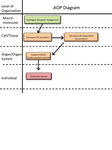 A graphical representation of the AOP.This graphic should list all KEs in sequence, including the MIE (if known) and AO, and the pair-wise relationships (links or KERs) between those KEs.