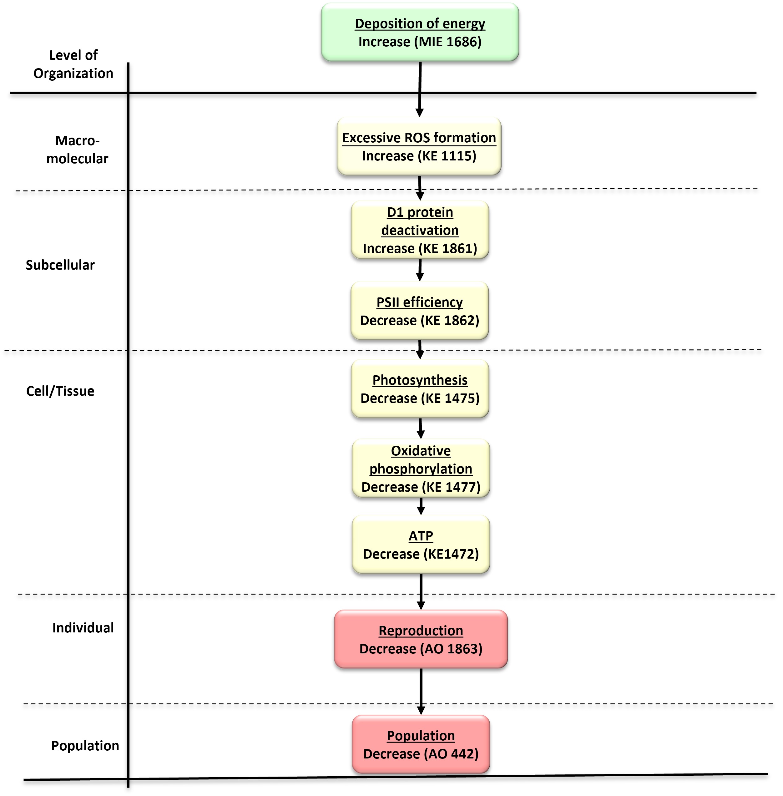 Ionising and non-ionizing radiation may excite and/or ionize intracellular water molecules to increase production of reactive oxygen species (ROS) in cells of primary producers. Such excessive ROS production can trigger oxidative damage of proteins (such as the D1 protein) in photosystem II (PSII) reaction centers and result in a reduction in PSII efficiency, total photosynthesis and ATP production. Reduction in the ATP pool may consequently reduce available energy to support development (size and weight) and/or reproduction (number of organisms and/or leaves) to reduce the overall population.