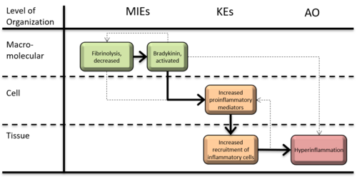 AOP 392 covers a set of events that act in concert towards perturbing inflammation. Hypo-fibrinolysis represents the first event (KE1866), in which interaction with SARS-COV-2 or nanomaterials causes decreased fibrinolytic response. The activation of the bradykinin system(KE1867) (MIE2), also instigated by SARS-COV-2 or nanomaterial stressors, can overactivate the bradykinin system and increases bradykinin production. As a result of hypo-fibrinolysis (KE1866), and bradykinin activation (KE1867), there is an increase in pro-inflammatory mediators secretion (KE1496), which signals the recruitment of pro-inflammatory cells into the lungs (KE1497). This KE process represents the changes occurring in inflammation. The increase in pro-inflammatory cells levels lead to a higher neutrophil to lymphocyte ratio, increased CRP, and high D-dimer and ferritin levels, all hallmarks of a hyperinflammatory state (KE1868). Hyperinflammation plays a critical role in driving the severity of the COVID-19 disease. Further exploration of the inflammation to hyperinflammation process is needed.
