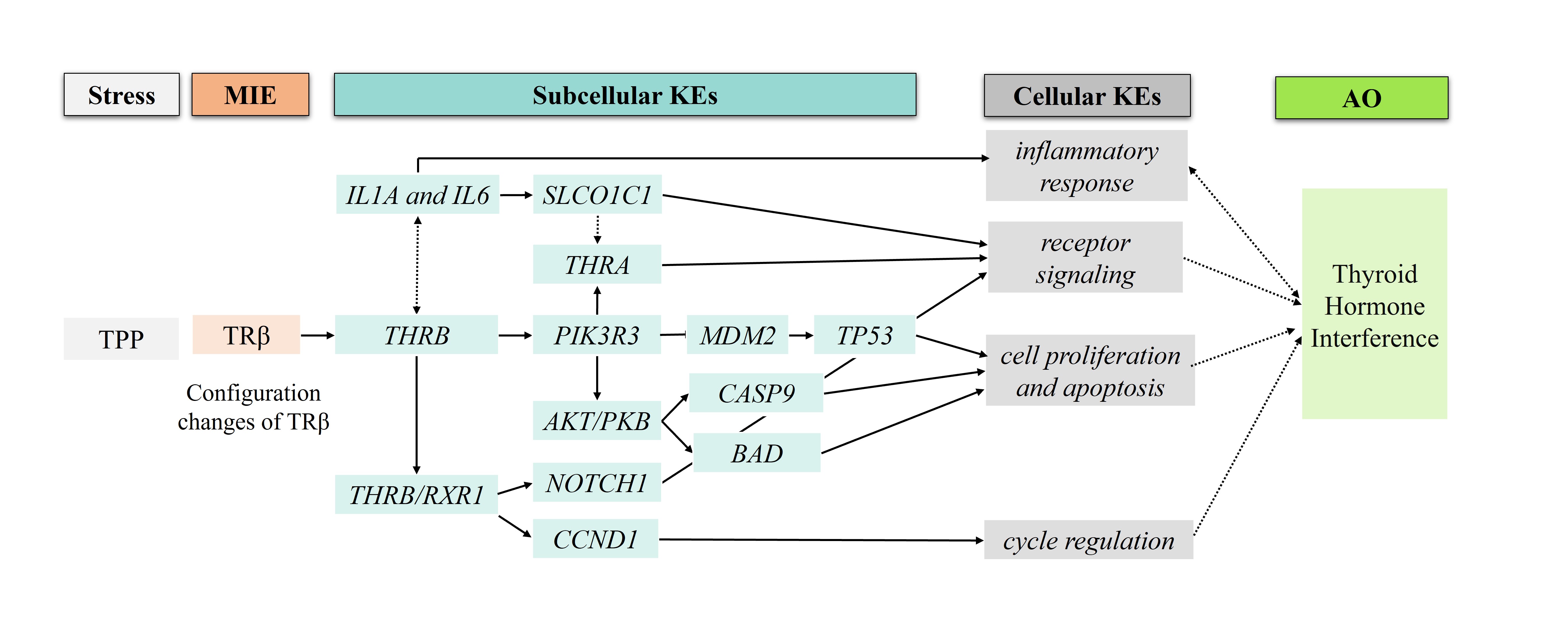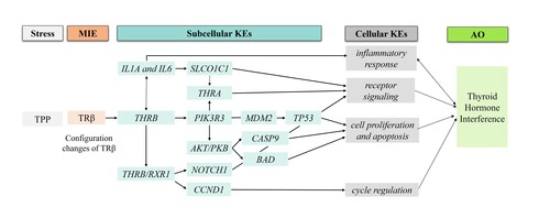 The critical molecular initiating event (MIE) was the configuration changes of C-terminal helix 12 (H12) of thyroid hormone receptor β (TRβ) induced by triphenyl phosphate (TPP) binding. The transcriptomic analysis extended the related key event (KE1) at the subcellular level, such as changes in gene expression levels for coding cycle regulation (CCND1), inflammatory response (IL1A and IL6), and cell proliferation and apoptosis (BAD, TP53 and CASP9). Then, the KE2 at cellular levels such as apoptosis, cell cycle control, and cell proliferation were influenced accordingly. As a result, these alterations led to thyroid disorder as adverse outcomes.