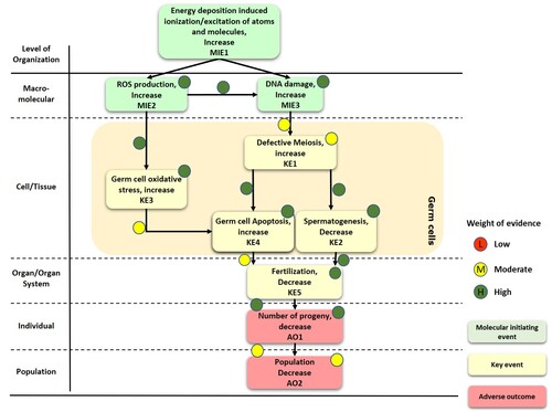 Despite the tolerance demonstrated under exposure to high acute doses (> 1 kGy) of ionizing radiation in the nematode Caenorhabditis elegans, adverse outcome at the reproductive level have been observed under exposure of early stages of larval development to low-medium chronic doses (≥ 2.8 Gy). L1-L4 larval stages were shown to be the most radiosensitive stages of development due to adverse effects on gamete production. Specifically, significant sperm reduction and dysregulation of genes related to sperm meiosis and maturation were identified as the main key events (KE1, KE2) causing reduced number of progeny (AO1). Adverse effects of ionizing radiation on proliferative cells were also shown by enhanced germ cell apoptosis (KE3, KE4) in F0 nematodes and significant DNA damage in embryonic cells (F1) of irradiated nematodes, which was corroborated by the dysregulation of genes related to cell-cycle checkpoints, DNA repair, embryonic and post-embryonic development. Increased ROS levels (MIE2) and AODs activation were measured in vivo and by gene expression analysis after chronic irradiation of F0 nematodes. This was not accompanied by any adverse effect on somatic cell viability or any visible phenotypical effect, indicating tolerance of somatic tissue compared to the observed adverse effects shown on the germ cells. The observed redox imbalance suggested a significant contribution of indirect effects, including oxidative damage to DNA (MIE3), and represented the molecular initiating event derived from ionization and excitation of atoms and molecules (MIE1) after chronic irradiation.