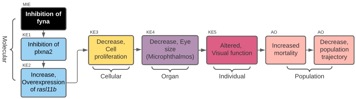 An overall assessment of this AOP shows that there is moderate biological plausibility to support a qualitative link between the Fyna kinase inhibition to the KE5 of altered visual function and high evidence linking KE5 to decreased population trajectory. Biological plausibility is considered moderate because there is ample evidence from gain- and loss- of function experiments and knock out animal models that support the relationships between key events and are consistent with current biological knowledge. A score of high in this respect would require further evidence for chemical inhibition or experimental downregulation of zebrafish Fyna kinase and direct or more extensive evidence linking Plxna2 inhibition to rasl11b overexpression. The evidence for essentiality of the KEs is mostly missing therefore the overall assessment of essentiality is low. The same goes for empirical support, currently there is no evidence for empirical support. Additional studies are needed to obtain data for empirical support, therefore, the empirical support of KERs is considered is low.