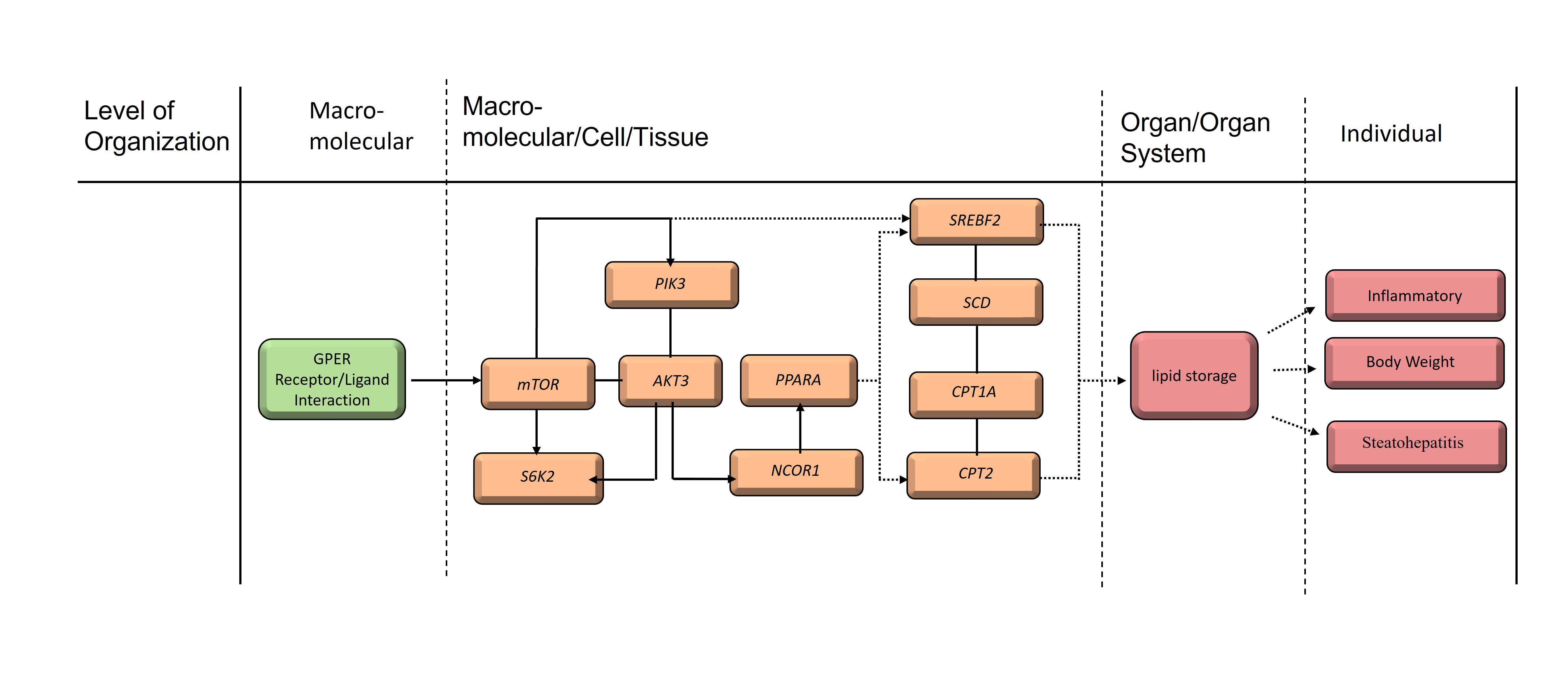 GPER活化被鉴定为TPP通过GPER信号通路诱导的脂质代谢异常中的主要MIE。TPP可以通过 影响TM6来诱导随后的信号通路,包括PI3K-Akt / NCOR1和mTOR / S6K2 / PPARα作为KE1(图6)来发挥GPER的激动作用。CPT1A和CPT2)与脂肪酸氧化代谢有关,并上调与脂质和脂肪酸合成(KE2)相关的基因(SREBF2和SCD)的表达。这些KLE最终通过与脂质代谢异常的分子因果关系导致脂质过度积累