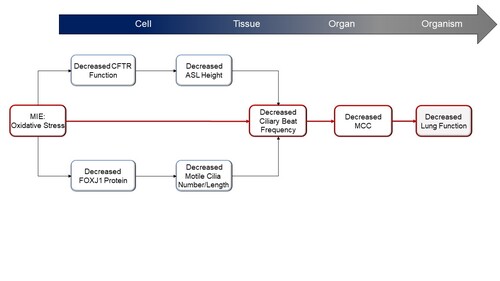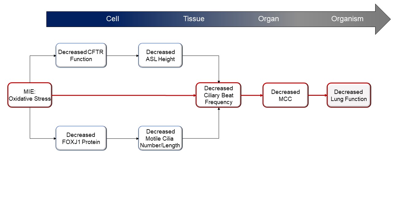We propose here an AOP that attempts to delineate how exposure to oxidative insults lead to decreased lung function (Luettich et al., 2021). This AOP evaluates one of the major processes known to be involved in regulating efficient mucociliary clearance (MCC)—ciliary function. MCC is a key aspect of the innate immune defense against airborne pathogens and inhaled chemicals and is governed by the concerted action of its functional components, the cilia and the airway surface liquid (ASL), which is composed of mucus and periciliary layers (Bustamante-Marin and Ostrowski, 2017). Disturbances in any of the processes regulating ciliary function can cause MCC dysfunction. Impaired MCC is linked to airway diseases such as chronic obstructive pulmonary disease (COPD) or asthma, both of which are characterized by decreased lung function and bear a significant risk of increased morbidity and mortality. Given the individual and public health burden of the consequences of lung function impairment, gaining a greater understanding of the underlying mechanisms is extremely important in the risk assessment of respiratory toxicants.
