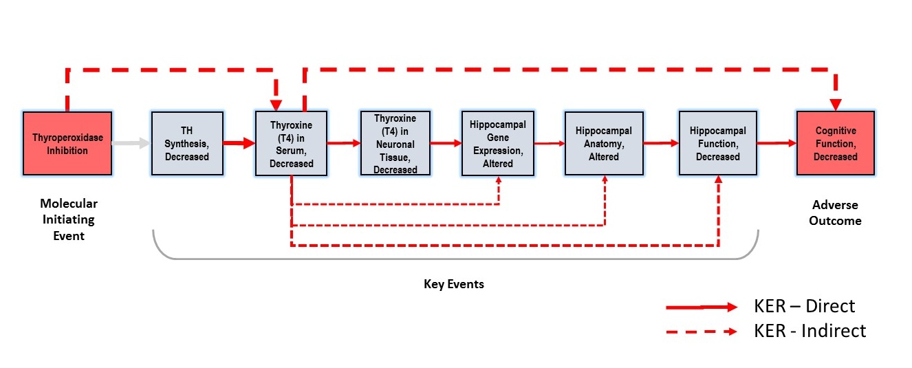Temporal concordance among the key events and adverse effect: There are two aspects of the temporal concordance of the key events in a developmental AOP. The first is the temporal concordance refers to the degree to which the data support the hypothesized sequence of the key events; i.e., the effect on KE1 is observed before the effect on KE2, which is observed before the effect on KE3, and so on. This translates to the temporal concordance of the AOP from TPO inhibition to decreased TH synthesis, reduced circulating TH concentrations, decreased nervous system TH, altered gene expression and anatomy in the hippocampus, and subsequent alterations in hippocampal physiology that result in decrements in cognition. The strength of the temporal concordance between these KEs varies from weak to strong (see Appendix Tables and individual KEs for detailed information). There is strong evidence for the early direct KEs from both empirical and modeling studies, and for many of the later KEs via the indirect KERs. The temporal concordance between TPO inhibition and TH synthesis is clearly evidenced by data from ex vivo and in vitro studies, as well as computational models (Leonard et al., 2016; Degon et al., 2008; Zoeller and Crofton, 2005; Cooper et al., 1983; Goldey et al. 1985; Christenson et al 1995). Data supporting the temporal concordance for the later KEs, i.e., from serum TH to changes in hippocampal physiology are limited or lacking.
