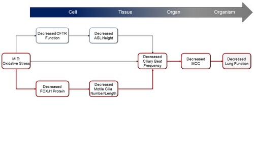 The definition of essentiality implies that the modulation of upstream KEs impacts the downstream KEs in an expected fashion. If blocked or failing to occur, the KEs in the current AOP will not necessarily stop the progression to subsequent KEs. Due to the complex biology of motile cilia formation and function, ASL homeostasis, mucus properties and MCC, the KEs and AO may be triggered because of alternative pathways or biological redundancies. However, when exacerbated, the KEs promote the occurrence of downstream events eventually leading to the AO. The causal pathway starting from the exposure to oxidants and leading to decreased lung function involves parallel routes with KEs, each of which is sufficient to cause the downstream KE to occur. Different mechanisms, such as oxidant-induced decreases in ASL height via CFTR function decline (AOP424) or oxidant-induced decreases in cilia number and length as a result of decreased FOXJ1 levels, lead to decreased CBF and decreased MCC. Each of these pathways contributes to the AO, but their relative contributions are difficult to evaluate. Based on the evidence we judge the MIE (Oxidative Stress), KE2 (FOXJ1 Protein, Decreased), KE3 (Motile Cilia Number/Length, Decreased), KE4 (Cilia Beat Frequency, Decreased), and KE5 (Mucociliary Clearance, Decreased) highly essential.