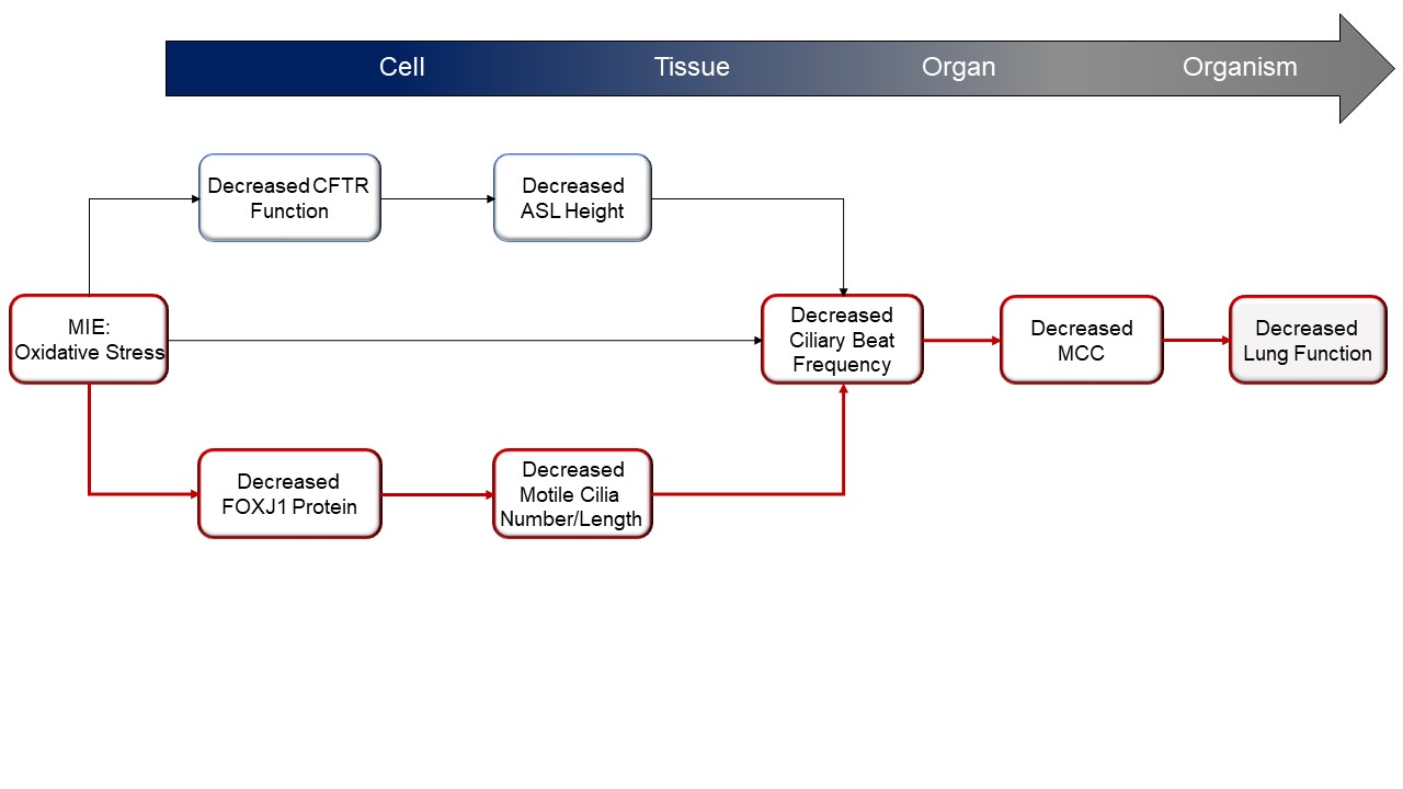 This AOP evaluates one of the major processes known to be involved in regulating efficient mucociliary clearance (MCC). MCC is a key aspect of the innate immune defense against airborne pathogens and inhaled chemicals and is governed by the concerted action of its functional components, the cilia and the airway surface liquid (ASL), which is composed of mucus and periciliary layers (Bustamante-Marin and Ostrowski, 2017). In response to various irritants and pathogens mucus is secreted by goblet cells, and cilia sweep mucus upward by coordinated beating motions thus clearing the airways from these substances. The ciliated airway epithelial cells are typically covered by hundreds of motile cilia. Cilia formation is initiated and coordinated by a distinct gene expression program, led by the transcription factor forkhead box J1 (FOXJ1) (Brody et al., 2000; Zhou and Roy, 2015). FOXJ1 appears to be the major factor in multiciliogenesis, whereby its activity is necessary and also sufficient for programming cells to assemble functional motile cilia (Vij et al., 2012). A decrease in the levels or absence of FOXJ1 protein in cells of the respiratory tract therefore inhibits ciliogenesis, preventing physiological mucus clearance and decreasing MCC. MCC dysfunction is linked to airway diseases such as chronic obstructive pulmonary disease (COPD) or asthma, both of which are characterized by decreased lung function and bear a significant risk of increased morbidity and mortality.