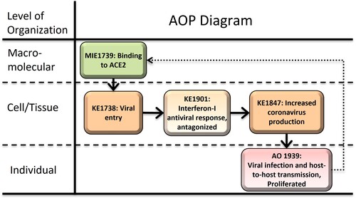 At the time the CIAO project was initiated in mid- to late 2020, the molecular initiating event of the SARS-CoV-2 spike protein binding to the host ACE2 receptor was known, and many of the severe disease outcomes required binding, cell entry and viral replication to spread to other tissues and organs from the point of infection. With the strategy of reuse of key events in the AOP-Wiki, AOP 430 was developed as a hub containing the MIE and early KEs of viral entry and replication. Through early literature and understanding of the virus, it was determined that evasion of the innate immune interferon-I (IFN-I) antiviral response is a key event to allow the virus to replicate and produce new virions to spread from cell to cell, and to generate a viral load for host-to-host transmission, including transmission across species (zoonotic spillover) and was included in the hub. The contributors are experts in their fields, including Dr. Young Jun Kim, who has conducted ACE2 binding research; Dr. Maria João Amorim, virologist; Dr. Laure-Alix Clerbaux, EU-JRC researcher and CIAO coordinator with other EU-JRC researchers Dr. Nikolaos Parissis and Dr. Alicia Paini; Dr. Penny Nymark, researcher with a background in genetics, cancer, toxicology and AOP development, and member of the CIAO coordination team; and Dr. Sally Mayasich, researcher with a background in molecular biology of endocrine and immune interactions, bioinformatics, toxicology and risk assessment. These researchers developed the AOP through focused literature searches with peer-reviewed literature preferred, but in some cases pre-prints are referenced due to the short timeframe for emerging information during the rapidly evolving COVID-19 pandemic. The COVID-19 AOPs were developed within a collaborative exchange of information through online platforms and frequent virtual meetings and workshops which also enlisted the guidance of CIAO members experienced as AOP developers and coaches. Dr. Carlie LaLone, bioinformatician, toxicologist and AOP developer and coach, US Environmental Protection Agency, contributed to later stages of development of the AOP.