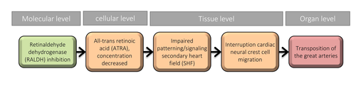 The aim was to describe a linear AOP of the relationship between inhibition of retinaldehyde dehydrogenase (RALDH), an all-trans retinoic acid (ATRA) synthesizing enzyme, and the subsequent disturbance of ATRA levels that can influence impaired positioning of the great arteries as the adverse outcome (AO) during cardiovascular development. The selected molecular initiating event (MIE) is inhibition of RALDH. This MIE was selected based on robust available literature. Intermediate key events (KE) are decreased ATRA concentration, disruption of progenitor cells of the second heart field (SHF), and reduced neural crest cell (NCC) migration. Evidence for this AOP is mainly generated in chick and mouse ablation or gene mutation studies. Human evidence is limited, but comparable mechanisms between vertebrates have been reported, thereby establishing relevance due to similarities in cardiovascular development. Impaired great artery positioning is related to reduced cardiovascular function that can result in fetal/embryonic preterm deaths or require surgical intervention to correct defects in newborns. Various factors can influence the formation of the cardiovascular system and the interplay between the pharyngeal endoderm, the splanchnic mesoderm (second heart field) and the neural crest is of importance for proper development. This AOP describes the influence of the secondary heart field (SHF) on cardiac neural crest cell migration and functioning, which in turn is essential for development of the great arteries.
