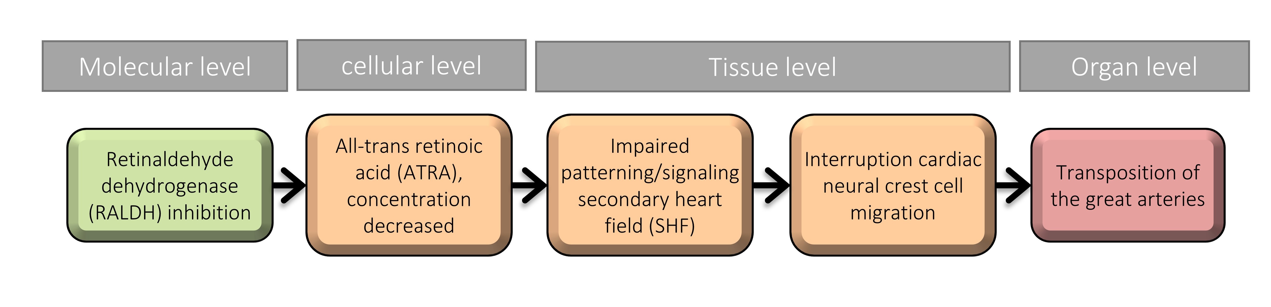 There is strong biological plausibility for a link between ATRA synthesis and normal positioning of the great arteries during early development, mainly determined by mouse RALDH knouckout studies. Because of evolutionary consistencies between vertebrates (Pérez-Pomares et al., 2009), the relationship is regarded biologically plausible also in humans. No direct human evidence is available and therefore the weight of evidence is not as strong.