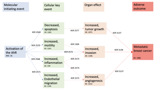 Breast cancer is the deadliest cancer in women with a poor prognosis in case of metastatic breast cancer. The role of the environments in the formation of metastasis has been suggested. We hypothesized that activation of the AhR (MIE), a xenobiotic receptor, could lead to breast cancer metastasis (AO), through different KEs, constituting a new AOP.