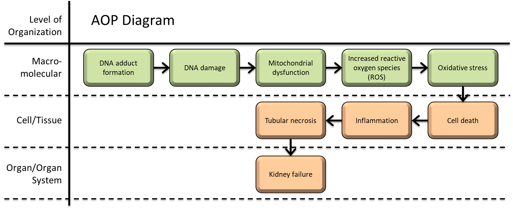 This Adverse Outcome Pathway (AOP) details the sequence of key events (KE) that connect DNA adduct formation to kidney failure. Platinum (Pt)-based antineoplastics that are routinely utilized as anticancer agents for the effective treatment of multiple cancer types, including breast, cervical, oesophageal, bladder, small cell lung and testicular cancer (1), can function as chemical stressors for the described pathway. Currently, cisplatin, carboplatin and oxaliplatin are the three most utilised Pt-based drugs used globally for the treatment of cancer, all possessing a similar chemical structure consisting of platinum, carrier and leaving groups, undergoing similar mechanisms of cytotoxicity. Renowned for being one of the most potent and effective chemotherapeutics available, preventing cancerous cells from multiplying by binding DNA strands, clinical application of Pt anticancer agents remains limited due to the moderate to life-threating severity of their adverse side effects, such as neurotoxicity, hepatoxicity, ototoxicity, cardiotoxicity and myelosuppression and dose-limiting nephrotoxicity (1, 2).