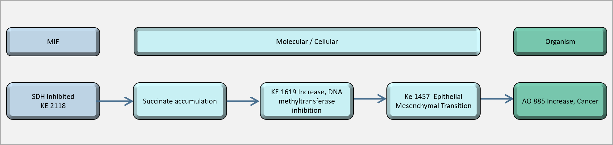 In this AOP, the Molecular Initiating Event (MIE) is the inhibition of succinate dehydrogenase (SDH, KE 2118), which leads to succinate accumulation (KE2243), inhibition of DNA methyltransferase (DNMT) activity (KE 1619), and activation of epithelial–mesenchymal transition (EMT, KE 1457). Strong evidence supports the essentiality of SDH inhibition and EMT activation, while succinate accumulation and DNMT inhibition are also supported by experimental data, although the direct causal links have varying strength depending on the studies. Overall, the evidence suggests that preventing any of these KEs can significantly alter the progression toward the AO.