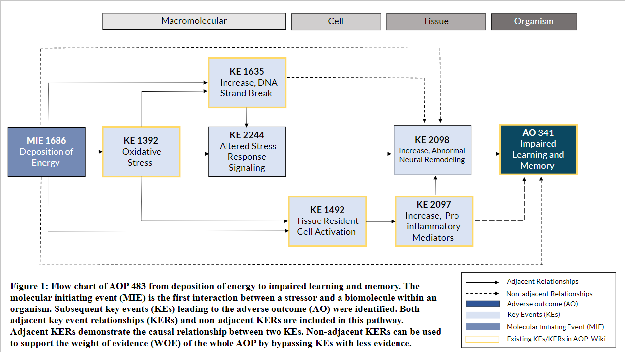 This AOP can serve as a foundational pathway for expansion to other cognitive disorders and CNS diseases from an MIE of deposition of energy. The strength of this AOP is in its rigorous and systematic collection and evaluation of evidence with moderate to high levels of qualitative evidence supporting the KERs.