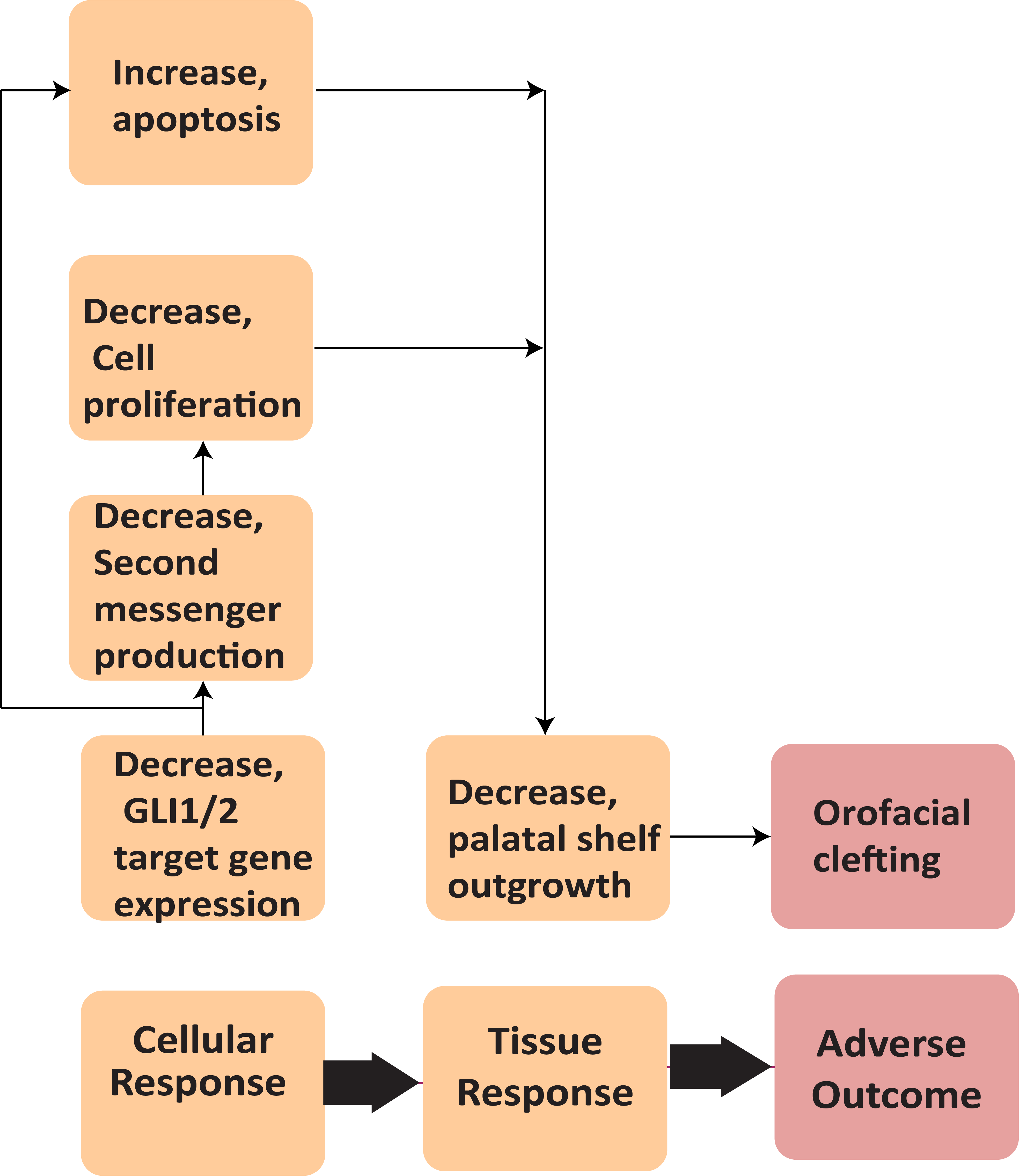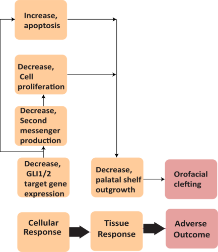 The intended use of this AOP from a regulatory standpoint is to improve predictive potential of developmental hazards as they relate to the SHH pathway and OFCs. It is hoped that this AOP can be applied to data from in silico and in vitro high-throughput screening assays (HTS) to guide selection of agents for further investigation in more representative models of orofacial development. Disruption of the Sonic Hedgehog pathway has broader outcomes than just OFCs and SHH is known to play a role in many aspects of embryonic development including patterning of many systems and limb and digit development. This AOP can be used as part of an integrated assessment of toxicity and can help to guide risk assessment for potential exposures during development.