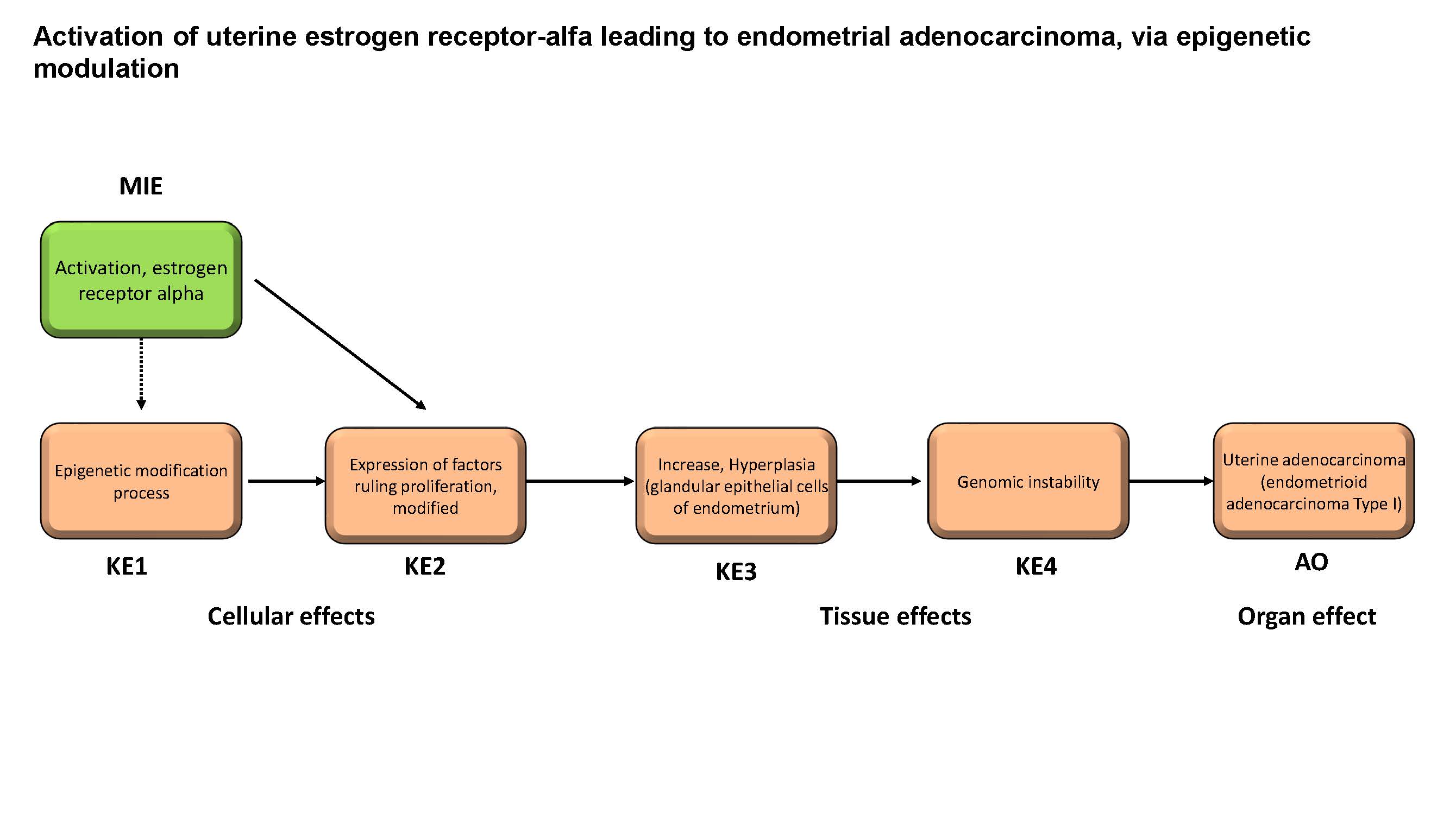 This AOP describes the links between activation of the uterine estrogen receptor alpha and endometrial adenocarcinoma via epigenetic modulation. An evidence-based approach methodology was adopted for this specific purpose. Uterine (endometrial) adenocarcinoma (UA), the most common type of uterine cancer, is a cancer that arises in the layer of cells that make up the inner epithelial lining of the uterus (endometrium). Based on clinical, pathological and molecular characteristics, human uterine adenocarcinomas have been divided into two broad categories: type I and type II. The Molecular Initiating Event (MIE) in this AOP is the activation of the uterine estrogen receptor alpha (ERα). ERα is a receptor covalently bound by estrogens, which upon dimerisation can translocate to the nucleus where it can bind to estrogen-responsive elements and recruit co-activators or co-repressors, which can attract co-regulatory proteins. The mayor KEs are an epigenetic modification process (KE1), the modification of expression of factors ruling proliferation (KE2), than hyperplasia of glandular epithelial cells of endometrium (KE3), than a genomic instability (KE4) than lead to uterine adenocarcinoma (AO).