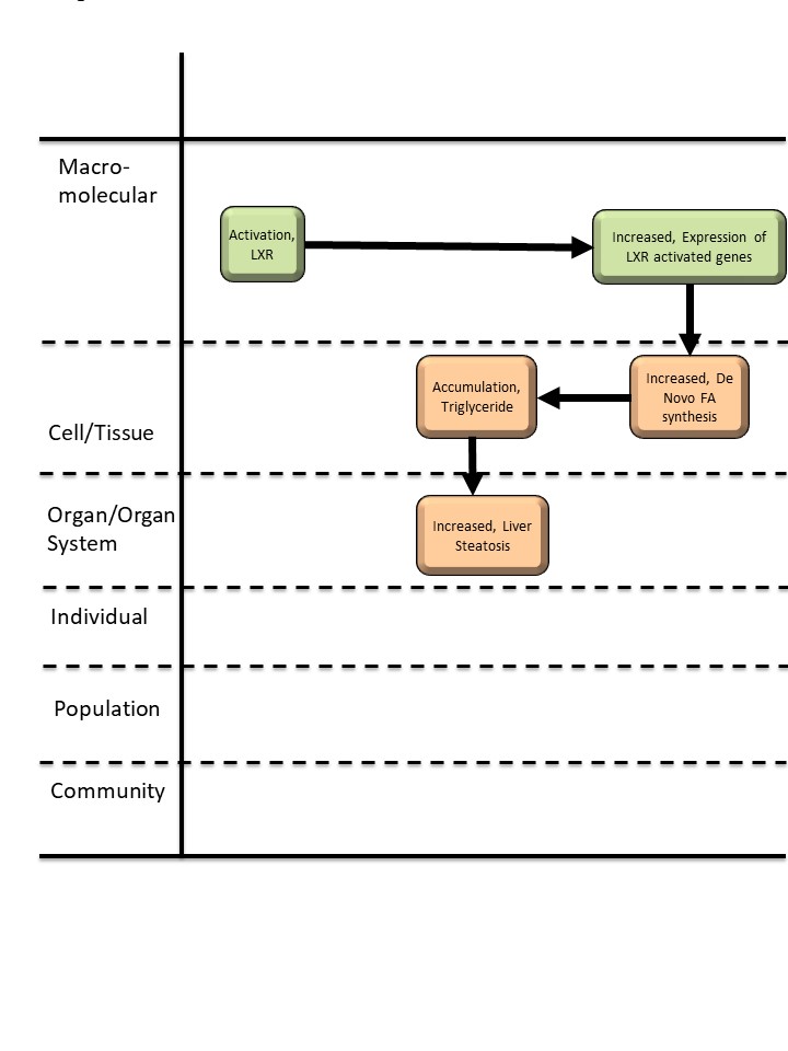 Liver X receptor (LXR) belongs to a class of nuclear receptors [Arhyl hydrocarbon receptor (AHR), Constitutive androstane receptor (CAR), Oestrogen receptor (ER), Farnesoid X receptor (FXR), Glucocorticoid receptor (GR), Peroxisome proliferator-activated receptor (PPAR), Pregnane X receptor (PXR), Retinoic acid receptor (RAR)] that are needed for normal liver function, but for which increased activaton (i.e. activation by binding by chemical stressors) can lead to liver injury, including steatosis (Mellor et al. 1996). An increasing number of chemical stressors have been shown to increase LXR activation (Moya et al. 2020). Activation of LXR has been linked to increased expression of a group of genes (ChREBP, SREBP-1c, FAS and SCD1) involved in increasing de novo fatty acid synthesis (Mellor et al. 1996, Schultz et al. 2000, Postic and Girard 2008). Increases in de novo fatty acid synthesis is one of the main pathways for increases in triglycerides in livers (Angrish et al. 2016). Increases in triglycerides can result in histological changes to cell structure and disruption of normal biochemical function, ultimately resulting in steatosis as a primary adverse outcome (Angrish et al. 2016; Mellor et al. 1996).