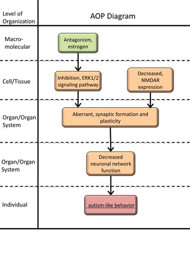 We chose two widespread plastic-derived EDCs, diethylhexyl phthalate (DEHP) and bisphenol A (BPA), as stressors. Using public datasets and network-based approach, we constructed a chemical-gene-phenotype-disease network (CGPDN) and developed a preliminary AOP of GDM using literature mining. In this AOP, estrogen antagonism was identified as the MIE, and four KEs, including decreased NMDAR expression (KE1), ERK1/2 signaling pathway inhibition (KE2), aberrant synaptic formation and plasticity (KE3), and decreased neuronal network function system (KE4), were selected to connect estrogen antagonism and ASD (AO).