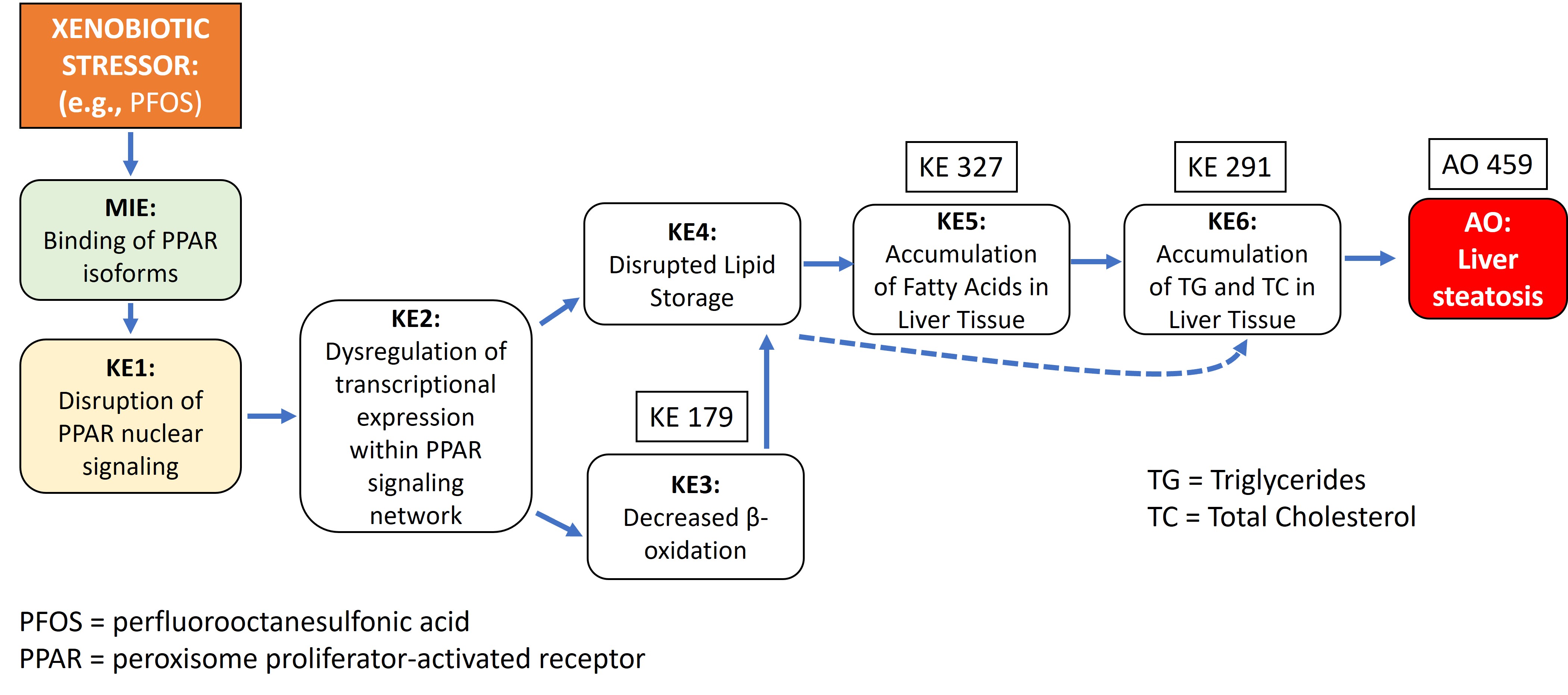 The weight of evidence from the literature indicates the potential for the molecular initiating even (MIE) of PFOS binding to the lipid-binding site of PPAR isoforms resulting in the key event of dysregulation of PPAR nuclear signaling (KE1). This KE results in the downstream KE of impacted regulation of diverse transcriptional expression pathways (KE2) that subsequently control KEs of altered lipid metabolism and transport. The effects of these KEs thus affect systemic lipid profiles resulting in the KEs of lipid accumulation in livers and hepatocellular vacuolation. Finally, these key events drive the adverse outcome (AO) of liver steatosis. Additional, more systemic AOs may also be affected by this MIE and cascade of KEs that can ultimately alter global energy metabolism, such as AOs of impacted growth and reproduction.