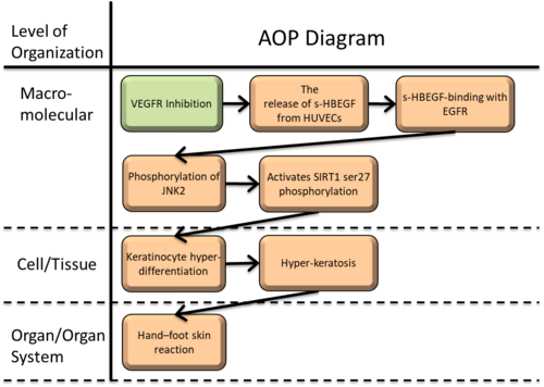 Drawing from previous research, a specific adverse outcome pathway (AOP) has been identified, potentially mediated by vascular endothelial growth factor receptor (VEGFR), likely offering insights into specific molecular mechanisms contributing to skin toxicity. In this AOP, the Molecular Initiating Event (MIE) is "VEGFR Inhibition," triggering six Key Events (KEs): " The release of s-HBEGF from HUVECs," "s-HBEGF-binding with EGFR," " Phosphorylation of JNK2," "Activates SIRT1 ser27 phosphorylation," "Keratinocyte hyper-differentiation," and "Hyper-keratosis."Ultimately, this pathway culminates in the Adverse Outcome (AO) of Hand-Foot Skin Reaction.