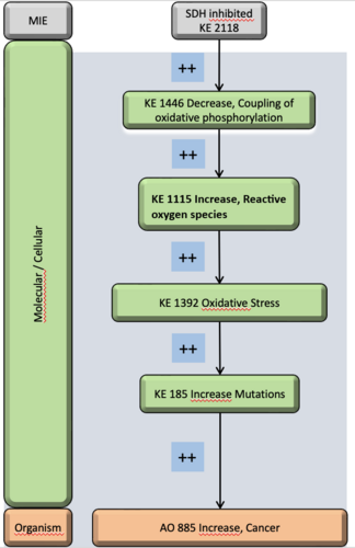 The development strategy for this AOP is based on the multitude of mechanisms of action that can be brought into play by the inhibition of SDH, a key enzyme in mitochondrial metabolism (Krebs cycle and respiratory chain); this inhibition may be genetic in origin, but it may also be chemical, due to the existence of man-made molecules that inhibit its catalytic cycle (in particular those targeting moulds); the initial consequences of inhibition include oxidative stress or an accumulation of succinate; some cancers are known to be associated with genetic invalidation. The development strategy for this AOP is part of the development of an AON with three independent AOPs.