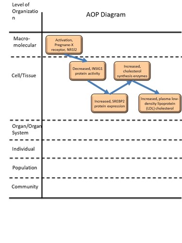 The focus of the originating work was to use an AOP framework to investigate the mechanisms linking Pregnane X receptor (PXR) activation to increased plasma low-density lipoprotein (LDL) cholesterol. Itkonen et al. (2023) provided network analysis from a literature search to assess the empirical evidence, biological plausibility and domain of applicability for each developed key event and key event relationship. Available evidence provided support of mechanisms for increased plasma low-density lipoprotein (LDL) cholesterol through multiple pathways, including: 1. Increased, cholesterol synthesis enzymes; 2. Increased, protein expression of proprotein convertase subtilisin/kexin type 9 (PCSK9). In this AOP, we focus on the pathway through Increased, cholesterol synthesis enzymes. Empirical studies were primarily from laboratory rodents and humans.