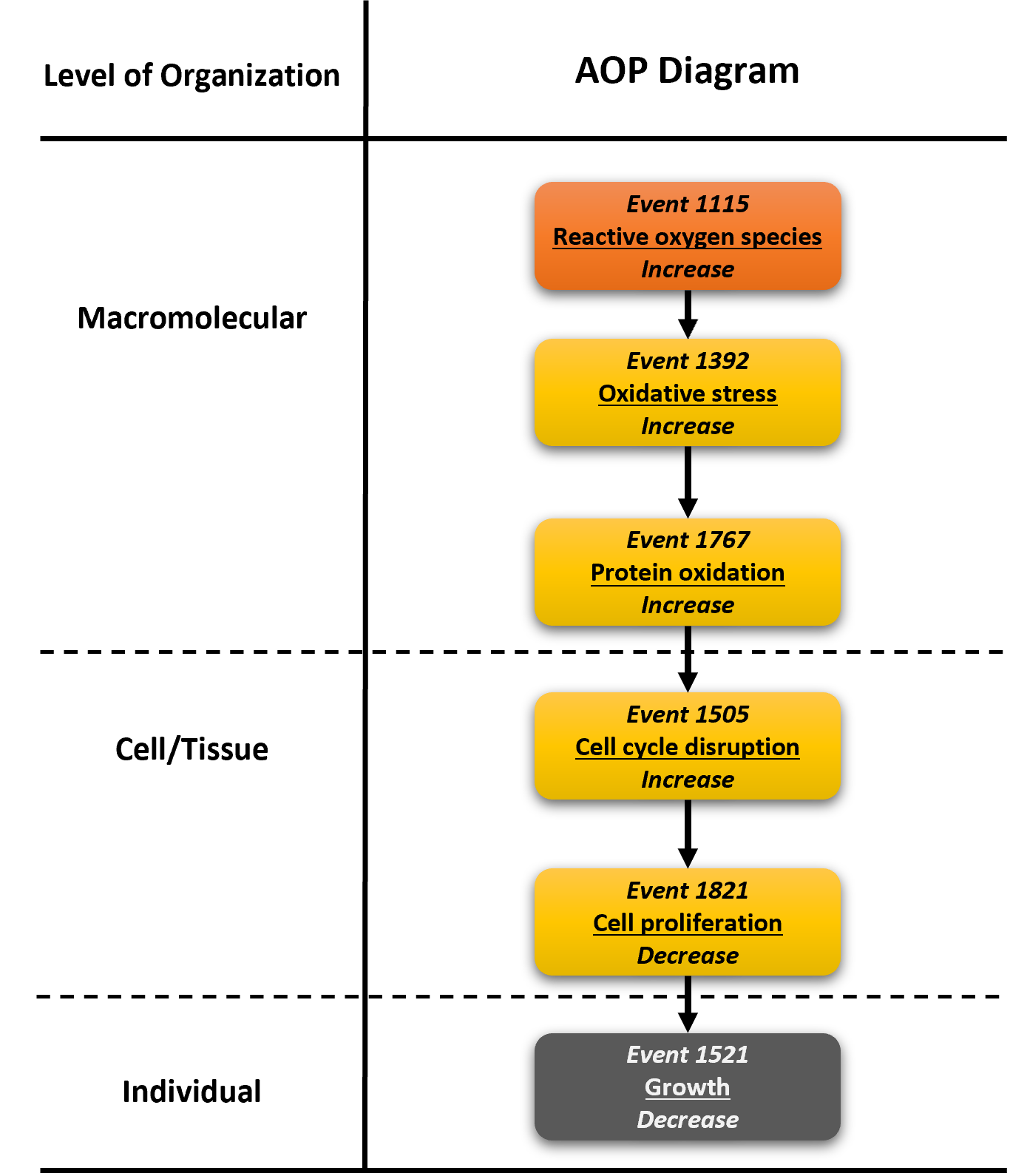 A graphical representation of the AOP.This graphic should list all KEs in sequence, including the MIE (if known) and AO, and the pair-wise relationships (links or KERs) between those KEs.